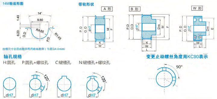 規格 形狀 節徑P.D 外徑O.D 擋邊外徑F 擋邊內徑M 透孔外徑E 輪轂直徑Dm 內孔dH7