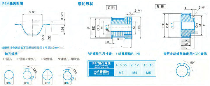 規格 形狀 節徑P.D 外徑O.D 擋邊外徑F 擋邊內徑M 輪轂直徑Dm 內孔dH7